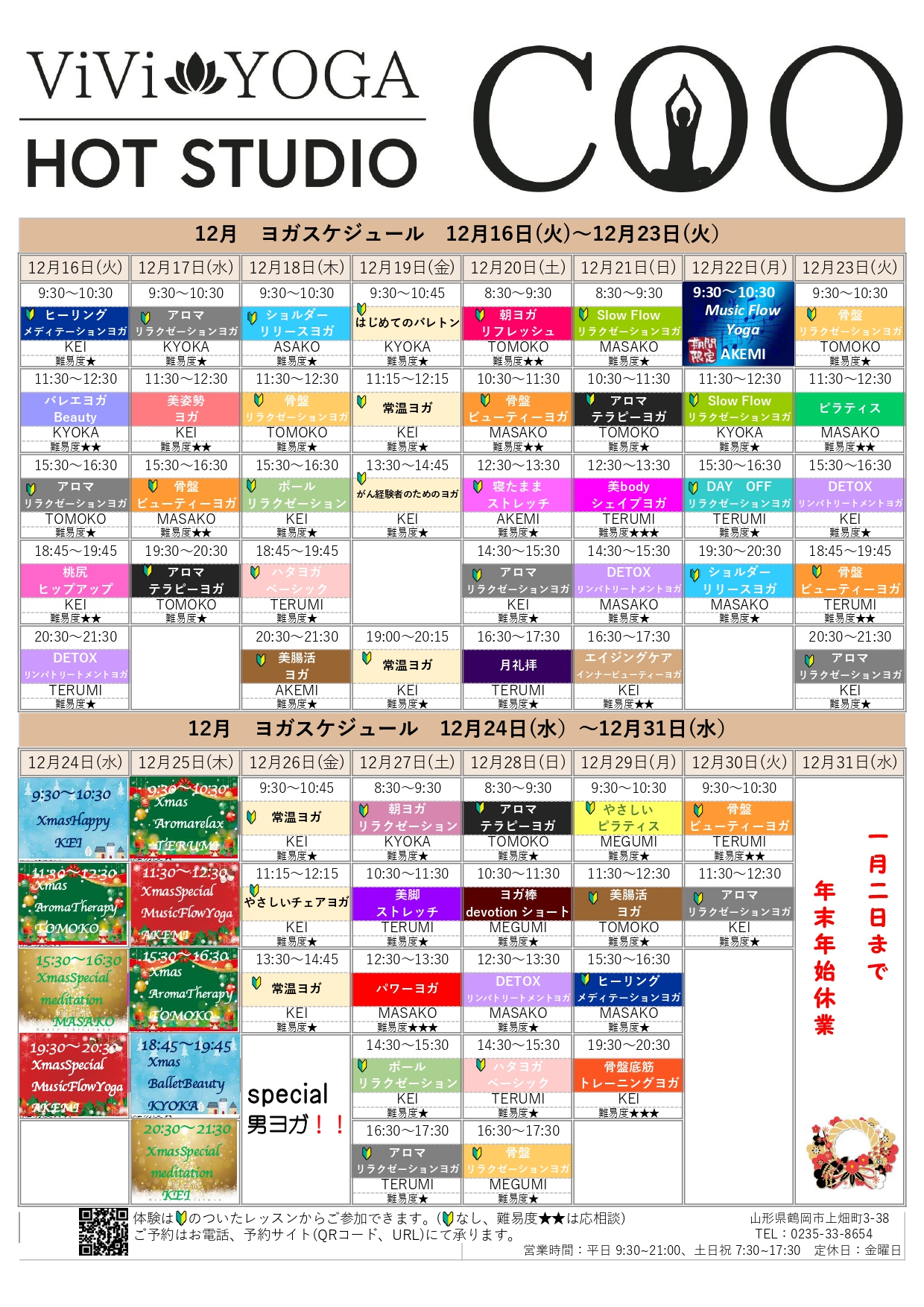 山形県鶴岡市のホットヨガスタジオビビヨガクー(美々ヨガクー・ViVi YOGACOO) > news > ホットヨガスケジュール 12月16日~30日