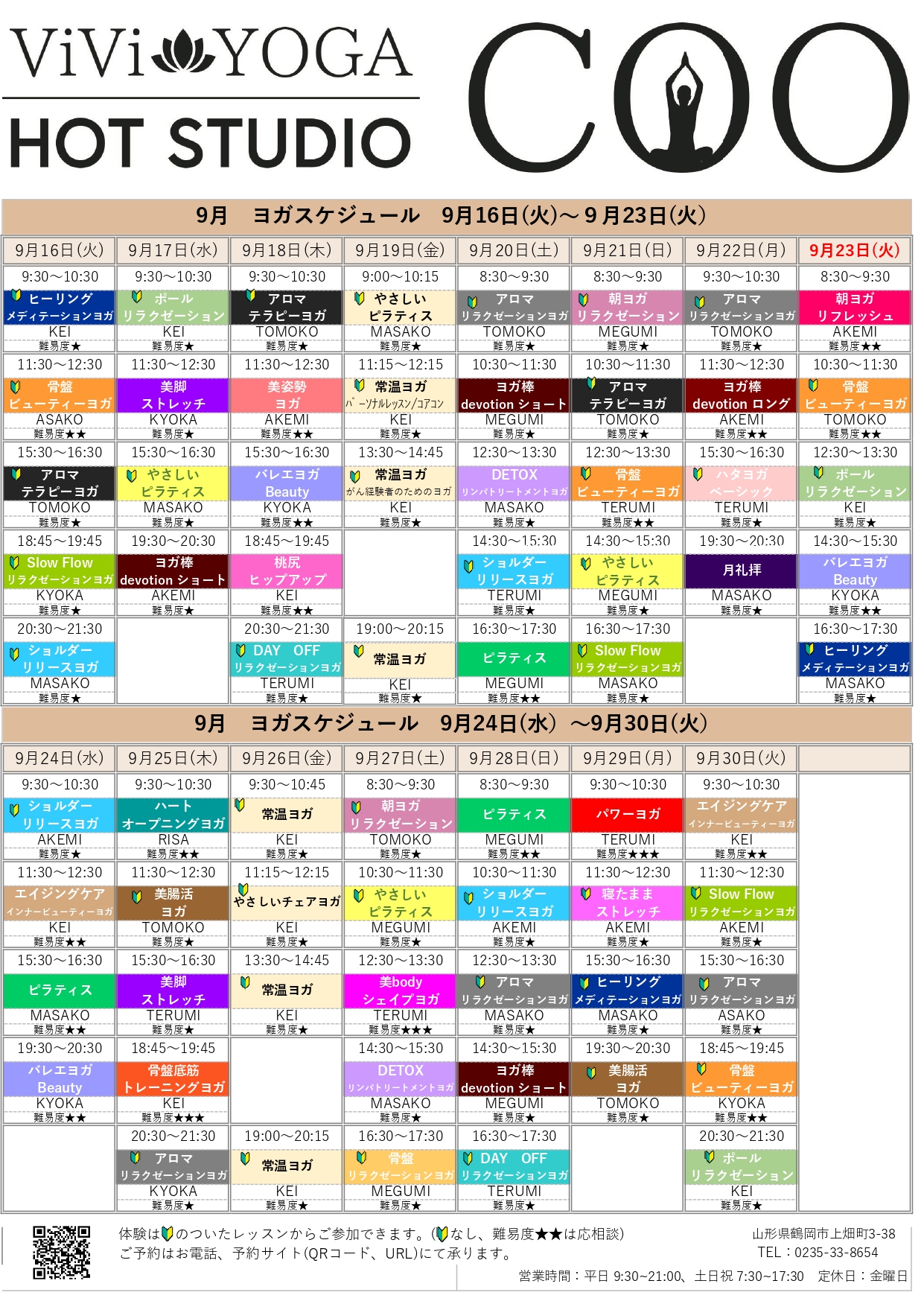 山形県鶴岡市のホットヨガスタジオビビヨガクー(美々ヨガクー・ViVi YOGACOO) > news > ホットヨガスケジュール 9月16日~9月30日